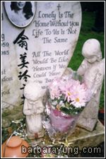 在我幾乎找遍了每一個角落,在我幾乎感到腳酸腿麻了,在我幾乎快要急得哭出來的時候。我是真的,終於,看見了那張讓我魂牽夢繞了不知多少個日日夜夜的臉。一個雞心的墓碑,旁邊陪著那個可愛的小天使。天啊!我終於找到了。我是真的來看你了,我是終於在2002年的最後一天站在了你的香塚前。我不知道我該說些什麼,也不知道我該做些什麼,只想就這麼靜靜地看著你。我拍了幾張照後,就坐在了那兒。那兒的祭品不多,有幾束早已枯萎的鮮花,,還有一捧是最近才送的,看見有一個台灣翁迷的一個罐子,裡面裝著滿滿的用彩紙做的星星,五顏六色的。墓碑上寫著“LONELY IS THE HOME WITHOUT YOU,LIFE TO US IS NOT THE SAME。 ALL THE WORLD WOULD LIKE BE HEAVEN IF WE COULD HAVE YOU BACK AGAIN”。